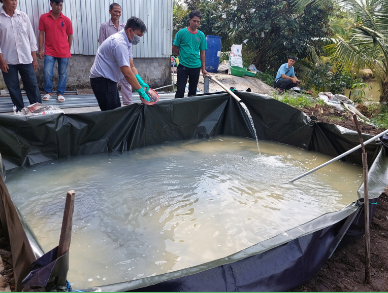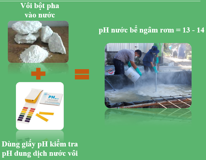 - Chuẩn bị nước vôi: Cho nước vào, mực nước cao khoảng 20 cm, sau đó cho vôi vào, khuấy đều và sử dụng giấy pH kiểm tra (pH = 13 – 14). Thường sử dụng khoảng 5 kg vôi cho 1m3 nước.