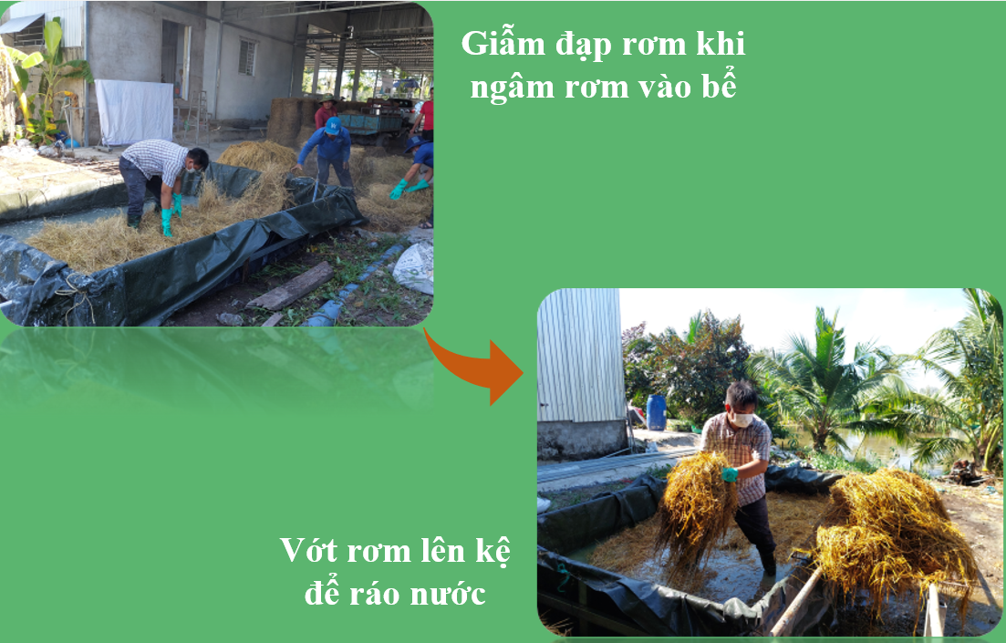 Cho rơm bể ngâm, khi ngâm nên giẫm đạp rơm, để rơm được thấm nước đều, sau khi ngâm khoảng 10 phút, thì vớt lên để ráo