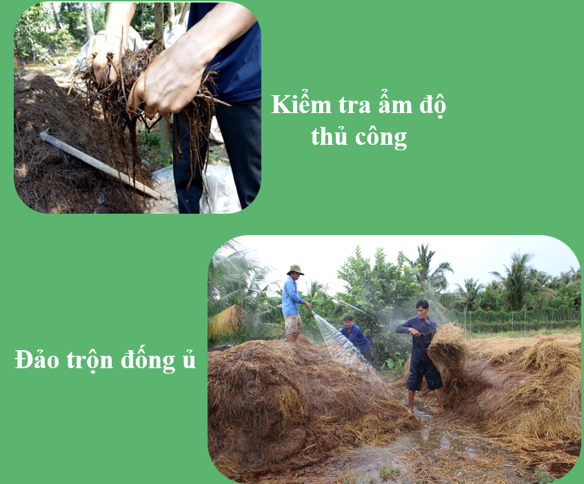- Đảo đống ủ 2 lần (sau 7 và 17 ngày ủ đống), đảo từ trong ra ngoài và từ ngoài vào trong.