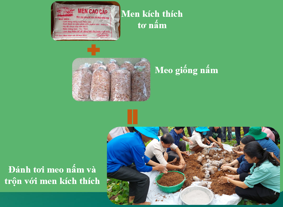 - Meo giống được đánh tơi và trộn với men kích thích tơ nấm tỉ lệ theo khuyến cáo. Hoặc trộn với phân trùng quế, liều lượng 70 – 160g và thành phần kích thích tơ nấm theo khuyến cáo