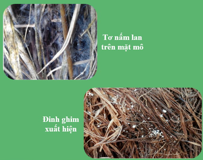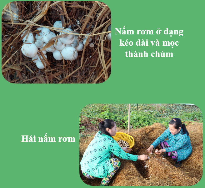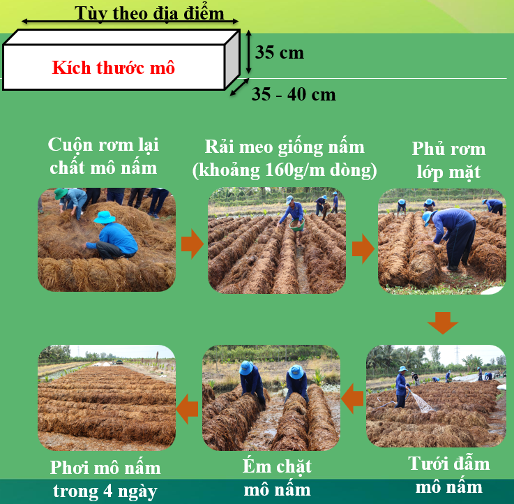 - Sau khi ủ đống được 16 – 18 ngày, tiến hành đóng mô. Kích thước mô rộng từ 35 – 40 cm và cao 35 cm. Rơm được lấy từ đống ủ rồi cuộn lại xếp thành dòng.