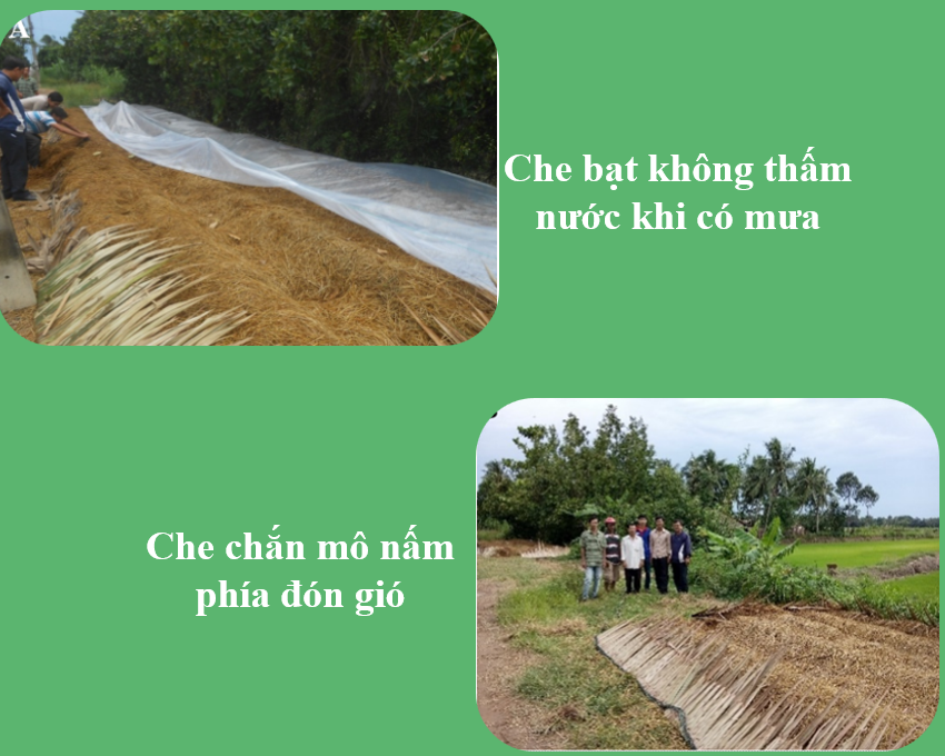 Lưu ý:Trong trường hợp có mưa thì che bạt khôngthấm nước. Khi che cần chú ý đến độ thông thoáng của mô nấm. Trong trường hợp chất nấm nơi có gió nhiều cần chú ý hướng gió và chất mô nấm sao cho gió thổi vào đầu mô để hạn chế gió